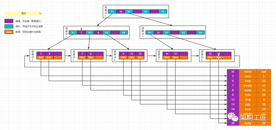 下面我们结合数据表来进一步说明,由于B+Tree的非叶子节点只存储键值信息,假设每个磁盘块能存储3个键值及指针信息,则变成B+Tree后其结构如下图所示: