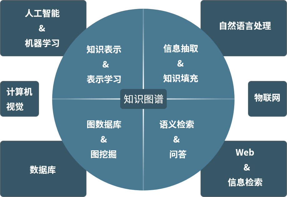 从技术角度而言,知识图谱是人工智能、自然语言处理、(图)数据库、万维网与信息检索等多技术的交叉与融合(如图3所示);其中核心的两个要素为语义化表示的知识和图结构的数据;具体涉及的技术要素则可以分为表示、存储、抽取、融合、推理、问答、分析等七个方面。