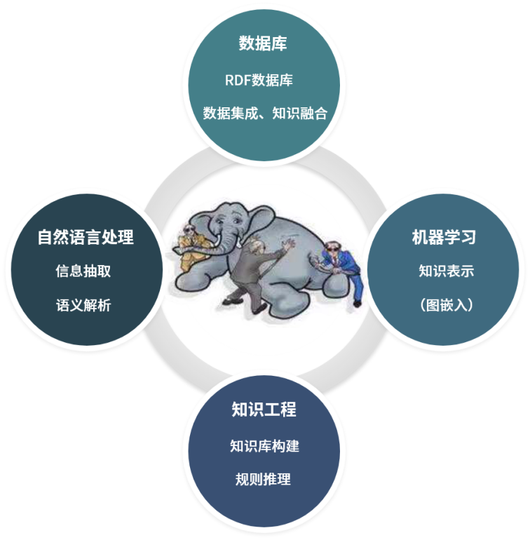知识图谱的典型应用场景包括语义搜索、智能问答、智能推荐、辅助大数据分析、语言理解、视觉理解、设备互操作等,目前已经在电商、医疗、工业、金融、农业、政府、军事、公共安全等行业得到的广泛应用。做知识图谱一定要有系统工程的思维,若仅把握其中某一方面的技术来做知识图谱会犹如盲人摸象(如图4);知识图谱技术与工程涉及数据、算法、工具和系统四个维度。