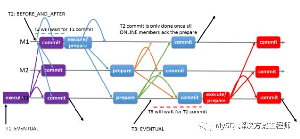 AFTER 事务将等待其更改已应用于其他成员。这可确保一旦此事务完成,所有后续事务都会读取包含其更改的数据库状态,而不管它们在哪个成员上执行。