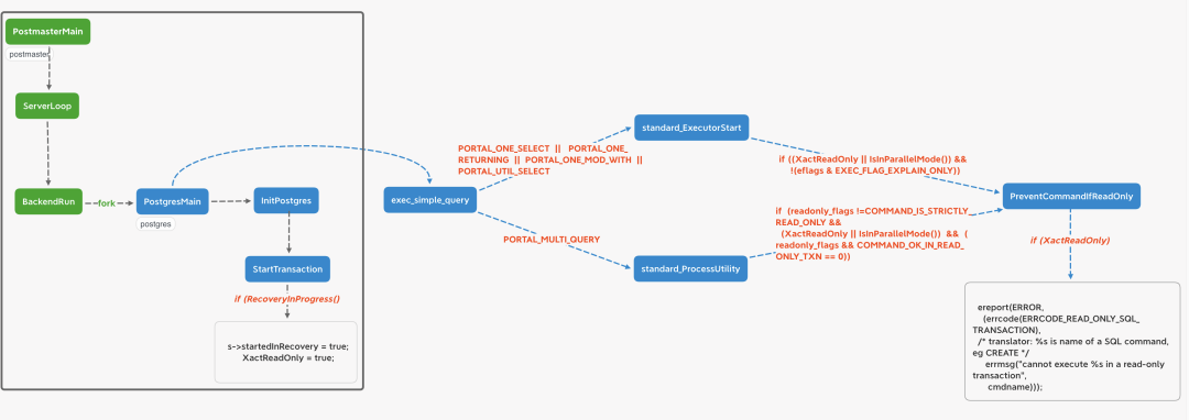 左边灰色框表示只读的设定,在fork出postgres之后,根据是否RecoveryInProgress来设定是否只读,实例为standby角色则设置为只读;