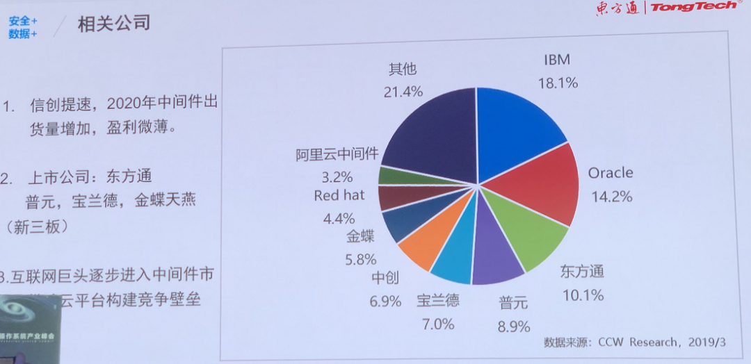中间件也分成很多类,英文叫Middleware,是从国外进入的。中间件的技术萌芽来自于IBM在金融行业做了一个小机上面的一个交易中间件,然后随着那个后来又一定要Tusedo也诞生了,也是一个交易中间件,后来被BEA和Oracle公司收购了。那么在1992年、1992年的时候,东方通的前身以前叫通科技,所以我们的软件大家都看到叫通系列。然后第一款产品的时候,当时也是在做银行的应用系统,然后为了保障银行的消息账户信息的可靠传输,我们就固定了一个保障消息可靠传输的消息中间件。后来1994年、1995年呢是中间件的元年,那一年BEA公司,专门成立了,号称专门做中间件的一个公司。后来逐步大家也知道,随着Java的这个越来越发展,应用中间件的分成好几个流派:基于Java,基于IIS,基于阿帕奇的,这些都是应用中间件,当然还有开源Tomcat。在初步发展以后,在2000年东方通推出了第一款应用中间件,Tongweb,也是在座各位、该行业里面接触最多的:5 6 7。后面我们在01年的话,我们的国产交易中间件在一个银行13个省的分行都在大规模的使用。在2013年时候,刚才我看到我们的人大金仓数据库获得一个国家科技进步二等奖,那我们这个中间件也是作为我们第一款获得国内中间件的国家科技进步二等奖,我们的交易中间件也是把国外的IBM、Tusedo它们的价格,还有以他们态度,各方面都远远的甩开,也节省了使用中间件极大的成本。随着发展,2008年的时候国产通Web,就进入我们中国移动集采木,大规模的替换一些国外的产品。在2014年的话,我们成为第一个上市的中间件公司,在2016-2019年开始,入围安可试点一期、二期,然后逐步的就迎来一个中间件的一个爆发期。因为随着国家的一些安全政策,以及刚才前面各位老师已经讲到过一些中兴、华为、微软黑屏的事件,所以说一下子这个行业就被放在了前台,很多券商也都在研究,各种各样的券商的研报。
