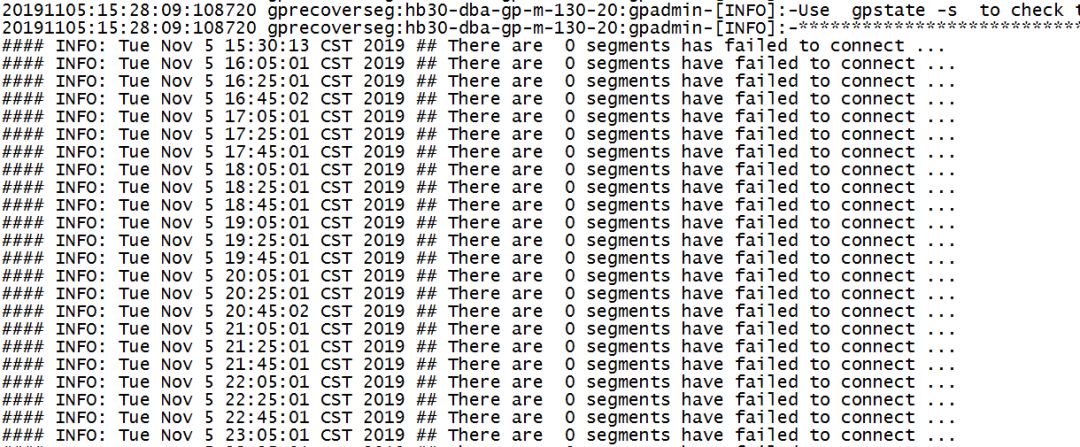 #!/bin/sh. home/gpadmin/.bash_profileGP_Cmd="/usr/local/greenplum-db/bin/psql"function check_segment_cnt(){err_segment_cnt=`${GP_Cmd} -t -c "select count(*) from gp_segment_configuration where status='d';"`echo $err_segment_cnt}err_segment_cnt=`check_segment_cnt`if [ $err_segment_cnt -gt 0 ];thenecho '#### INFO: '`date` '## There are ' $err_segment_cnt 'segments have failed to connect ...' >> tmp/gp_recovery.logelseecho '#### INFO: '`date` '## There are ' $err_segment_cnt 'segments have failed to connect ...' >> tmp/gp_recovery.logexitfi/usr/local/greenplum-db/bin/gprecoverseg -o home/gpadmin/recov >>/tmp/gp_recovery.log 2>&1sleep 50;if [ -s home/gpadmin/recov ];thenecho '#### INFO: '`date` '## segment recovery file is not empty,start segment recovery ...' >>/tmp/gp_recovery.logusr/local/greenplum-db/bin/gprecoverseg -i home/gpadmin/recov -a >>/tmp/gp_recovery.log 2>&1elseecho '#### INFO: '`date` '## segment recovery file is empty ...' >> tmp/gp_recovery.logfisleep 120;err_segment_cnt=`check_segment_cnt`echo '#### INFO: '`date` '## There are ' $err_segment_cnt 'segments have failed to connect ...' >> /tmp/gp_recovery.logecho >/home/gpadmin/recov