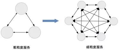 服务划分过细,单个服务的复杂度确实下降了,但整个系统的复杂度却上升了,因为微服务将系统内的复杂度转移为系统间的复杂度了。从理论的角度来计算,n个服务的复杂度是n×(n-1)/2,整体系统的复杂度是随着微服务数量的增加呈指数级增加的。
