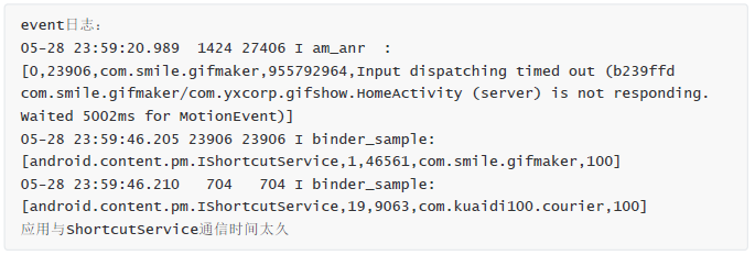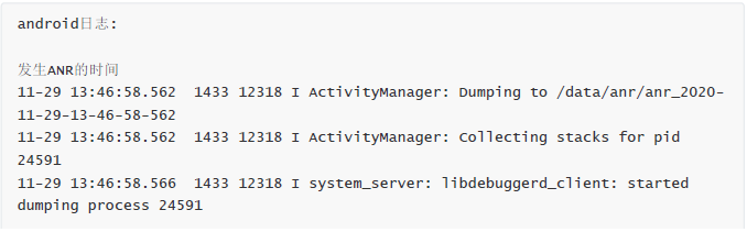 首先在android(system)日志中搜索“ANR in”关键字,通过此关键字主要查看