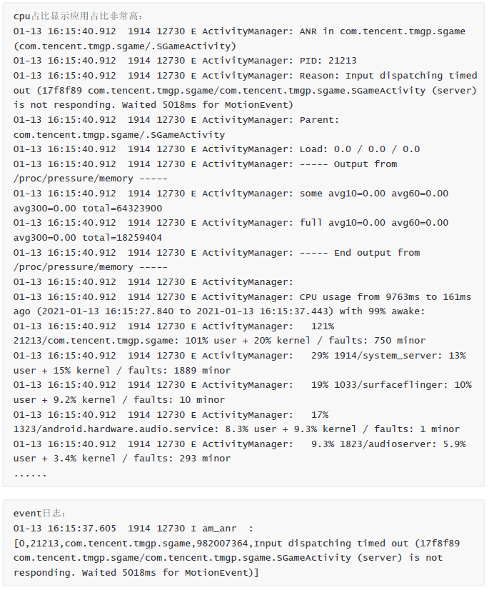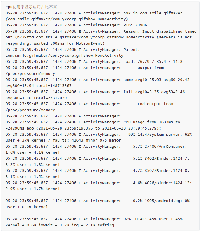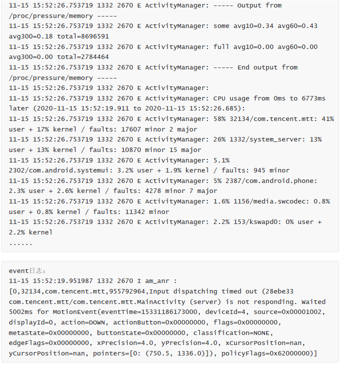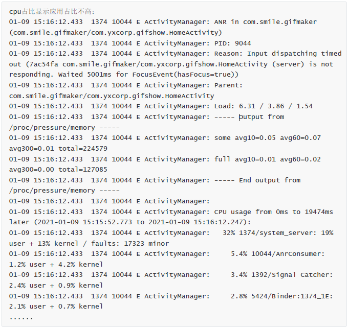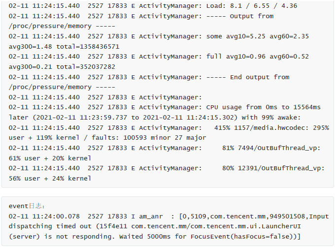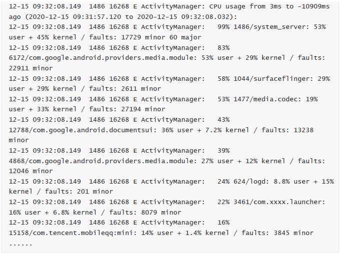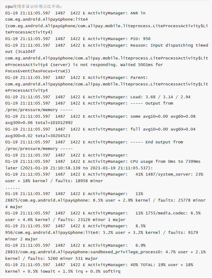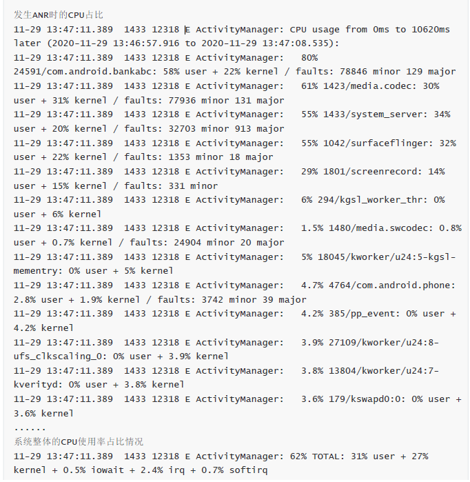 从android(高通平台在android.txt,MTK平台在system*.txt)日志中,查看系统中各个进程的cpu使用率,首先关注的进程就是发生anr的进程、system_server、kswapd0、kworker和其他占比较高的进程、以及最终统计的整体cpu使用率信息。例如,如果kswapd0占比较高,就说明内存存在一定的压力;iowait很高就说明系统在一些I/O耗时操作,就可以结合上下文日志及系统日志辅助分析发生ANR的原因。如果很多进程的cpu使用率普遍较高,发生anr应用的cpu使用率较低,此时可以怀疑发生anr的应用拿不到cpu时间片导致anr等。