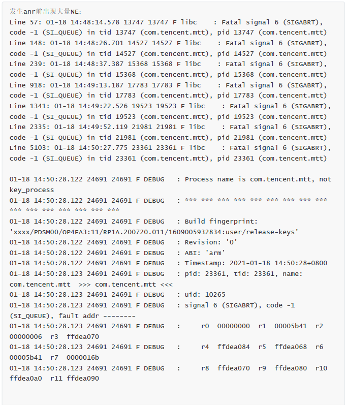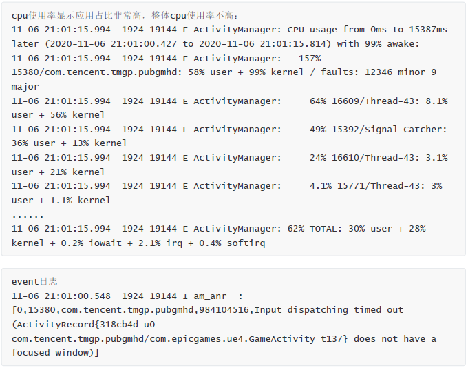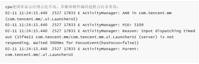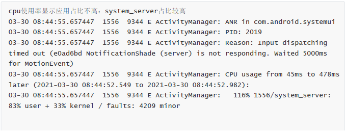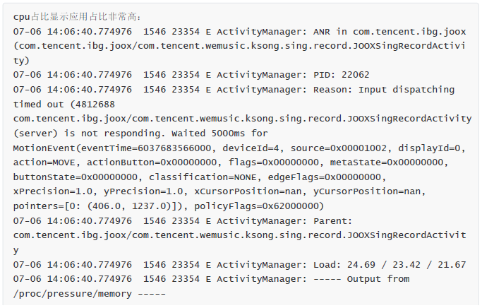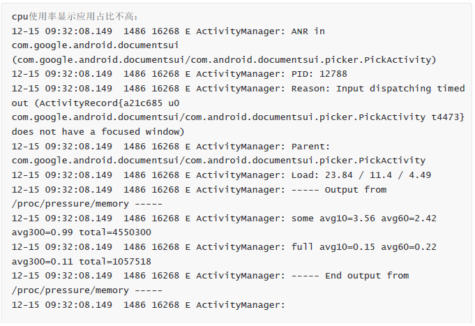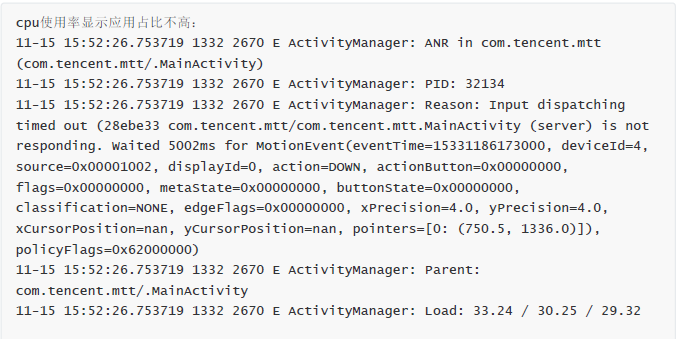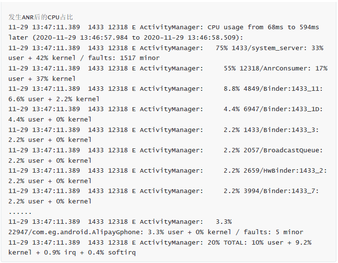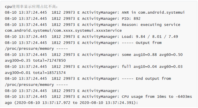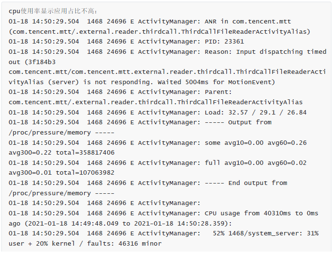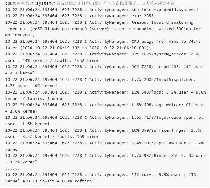 从android(高通平台在android.txt,MTK平台在system*.txt)日志中,查看系统中各个进程的cpu使用率,首先关注的进程就是发生anr的进程、system_server、kswapd0、kworker和其他占比较高的进程、以及最终统计的整体cpu使用率信息。例如,如果kswapd0占比较高,就说明内存存在一定的压力;iowait很高就说明系统在一些I/O耗时操作,就可以结合上下文日志及系统日志辅助分析发生ANR的原因。如果很多进程的cpu使用率普遍较高,发生anr应用的cpu使用率较低,此时可以怀疑发生anr的应用拿不到cpu时间片导致anr等。