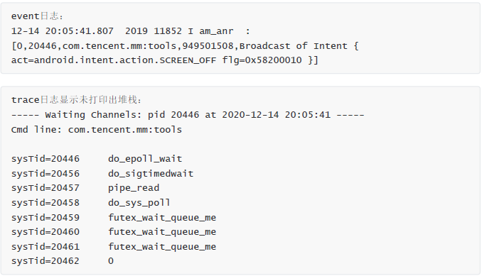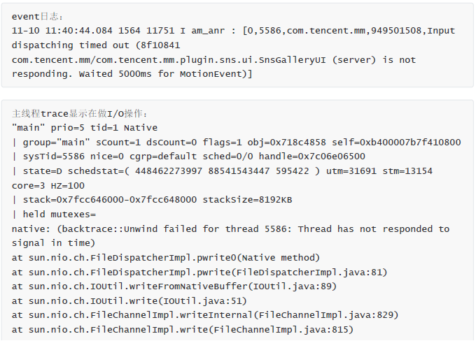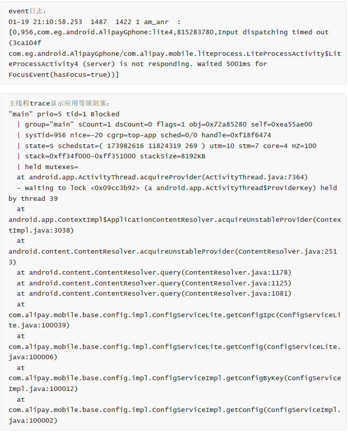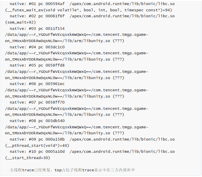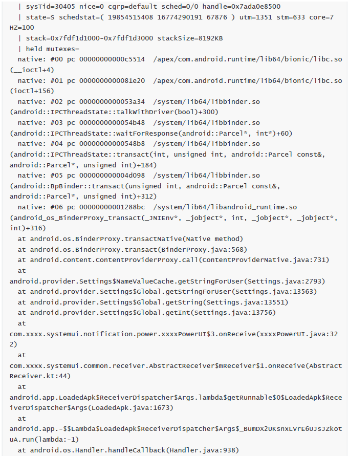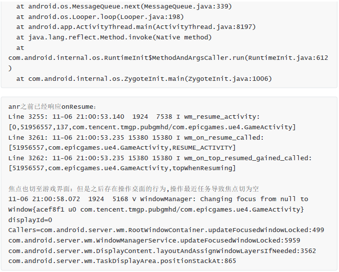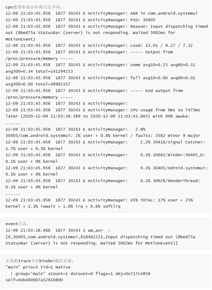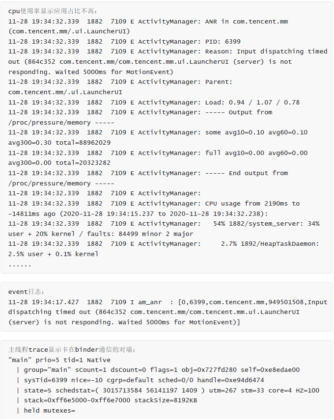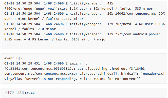 下面只是针对一种情况进行具体分析:这种情况很有可能是该进程的其他子线程消耗CPU资源导致,这就需要分析其他子线程的trace以及主线程在anr前后打印出的日志。一般情况可以通过分析top占比的子线程trace日志得出结论。