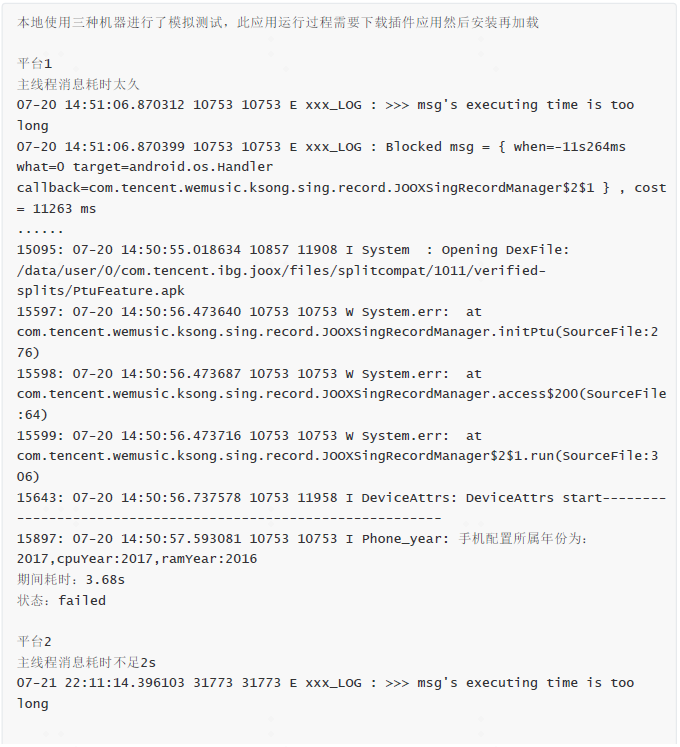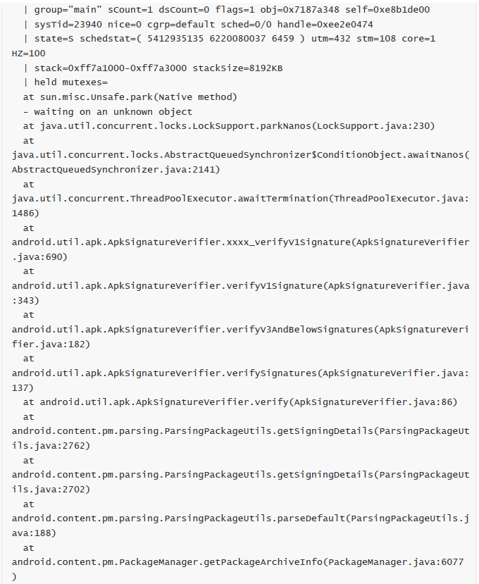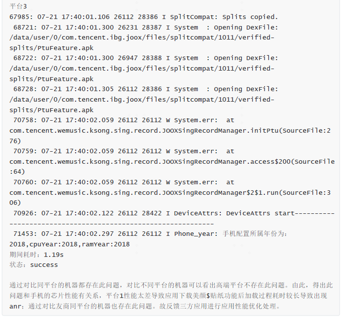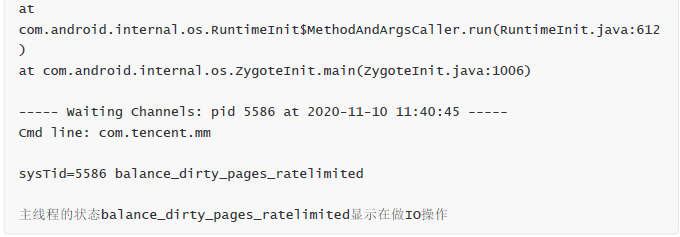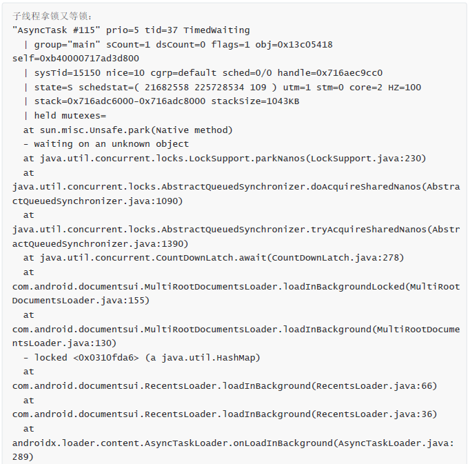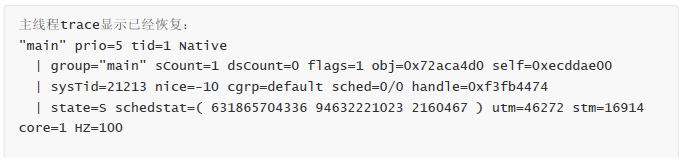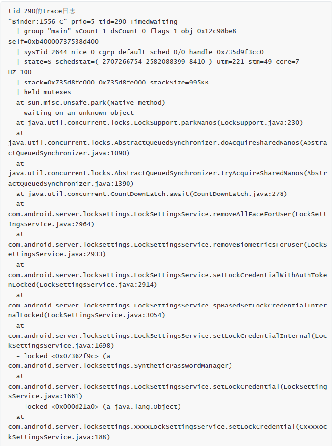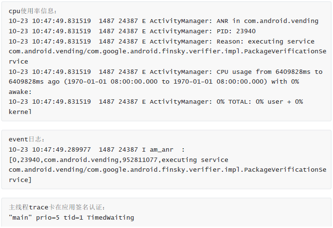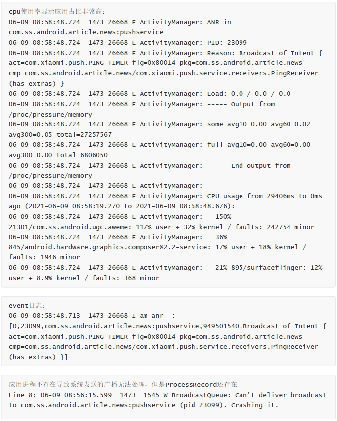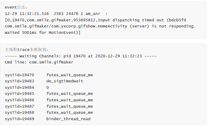 下面只是针对一种情况进行具体分析:这种情况很有可能是该进程的其他子线程消耗CPU资源导致,这就需要分析其他子线程的trace以及主线程在anr前后打印出的日志。一般情况可以通过分析top占比的子线程trace日志得出结论。