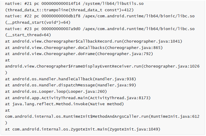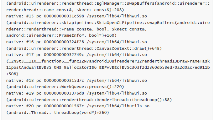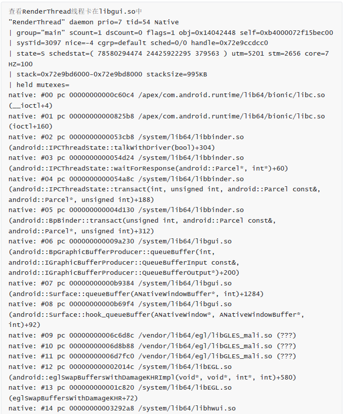 以上是中国农业银行应用的主线程trace日志,主线程在执行native方法,调用到nSyncAndDrawFrame说明进行GPU渲染的过程中出现耗时操作。