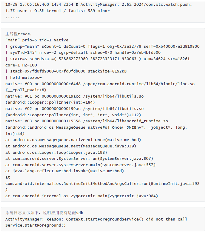 Context.startForegroundService() did not then call Service.startForeground():应用调用startForegroundService,然后5s内未调用startForeground出现ANR或者Crash,此问题属于应用未适配Android版本sdk。
