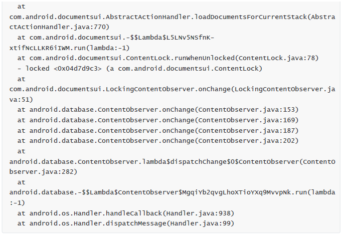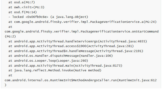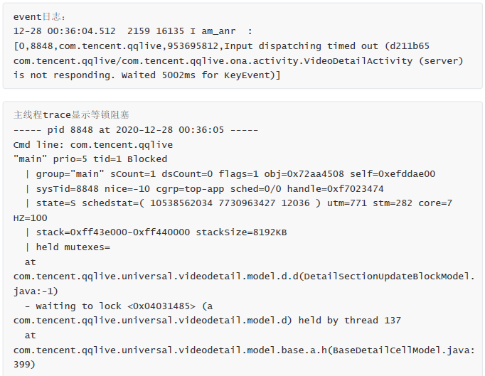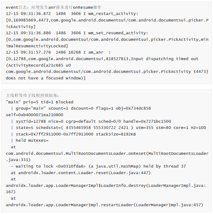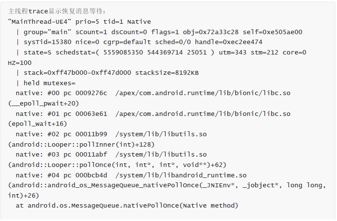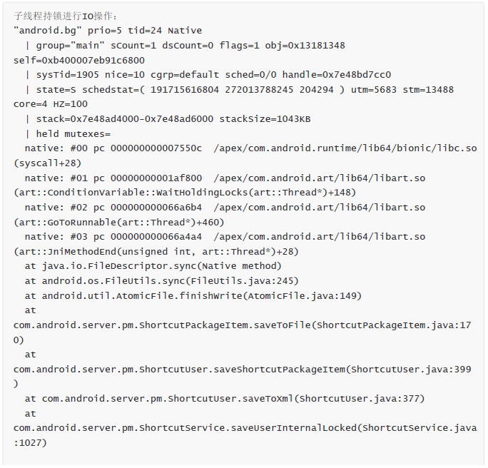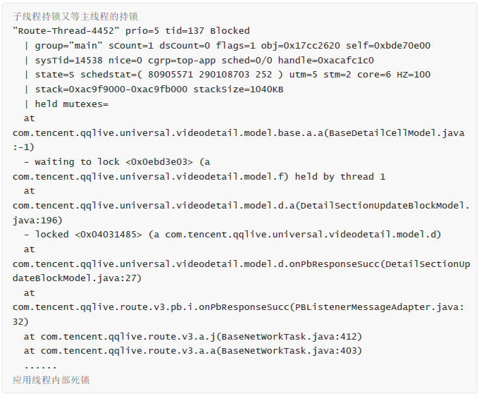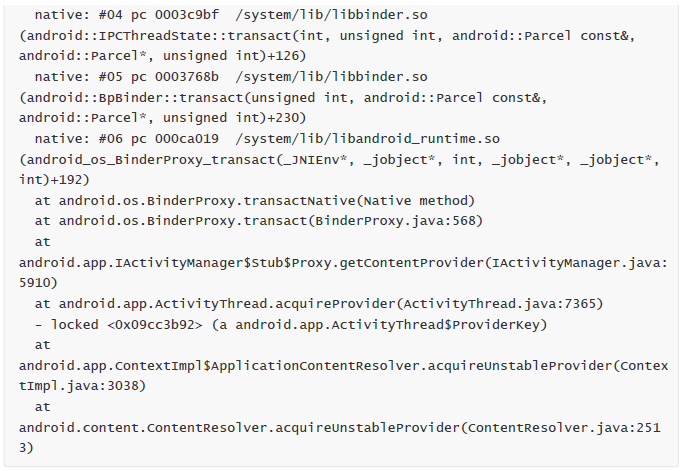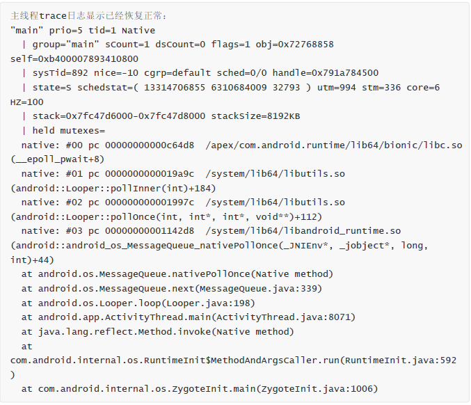 5、主线程在进程中或通过 binder 调用与另一个线程之间发生死锁。主线程不只是在等待长操作执行完毕,而且处于死锁状态。