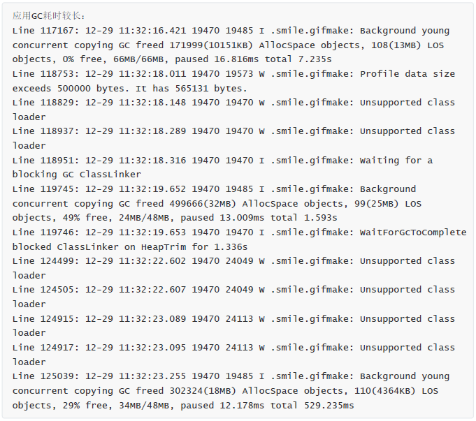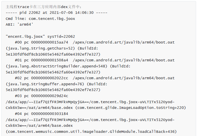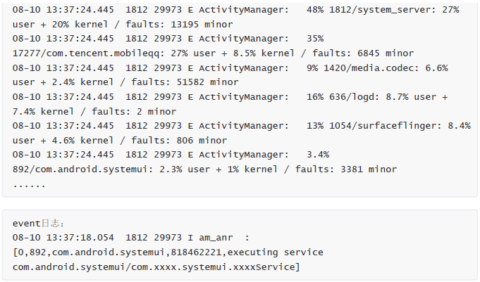 部分情况下,根据trace日志很难能够直接确定发生anr的原因,需要根据当时的系统运行情况进行辅助分析。综合当前的系统环境,可以从消息队列、系统可用内存、发热功耗、后台GC频率和时长、dex2oat耗时、冻结、频繁crash、温度过高、lowmemorykiller、root权限、system.err、system.out、binder_sample、slow operation等角度在日志中搜索关键字进行分析。也存在这种情况,系统日志信息不足以分析出anr的问题,此时需要借助日志中的systrace日志进行详细分析,虽然说大部分时间都对不上,但是也存在对上的时候。
