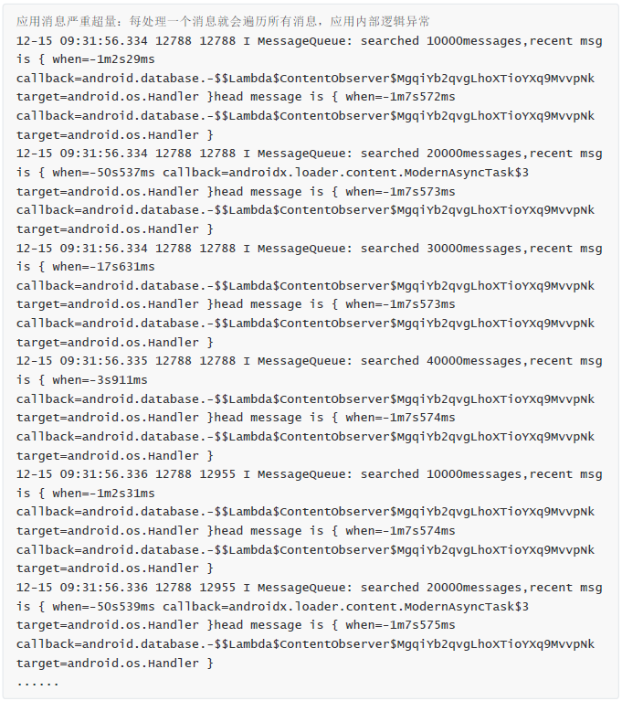 此种问题原因比较多:无焦点窗口导致应用无法响应进一步操作,出现messagequeue堆栈;多次binder通信,每次时长都较短;应用dump进程trace靠后,此时进程已经恢复;应用一直进行消息处理过程。