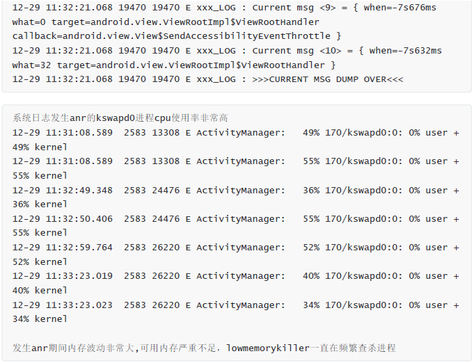 查看发生anr时间点前后的可用内存情况,以及系统查杀应用的频繁程度。