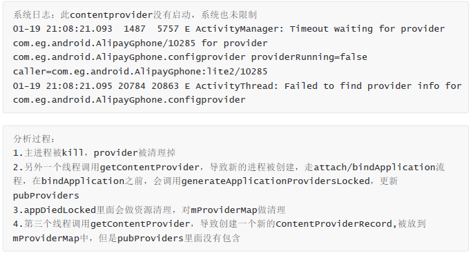 ContentProvider:几乎非常少见,publish执行未在10s内完成。