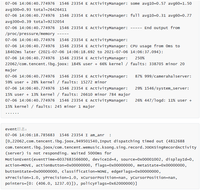 在日志中直接搜索关键字“lowmemorykiller”、“iowait”等,查看发生的时间点与发生anr的时间点是否基本对应。如果发生anr时间点附近,出现大量的lowmemorykiller日志信息,则说明当时内存已经严重紧张,可以较大概率认为是内存不足导致后台一直在查杀进程,同时影响前台应用的操作,导致前台应用操作耗时出现anr问题;如果出现iowait,则表示可能出现了I/O卡顿。