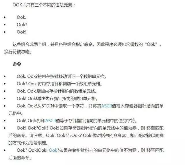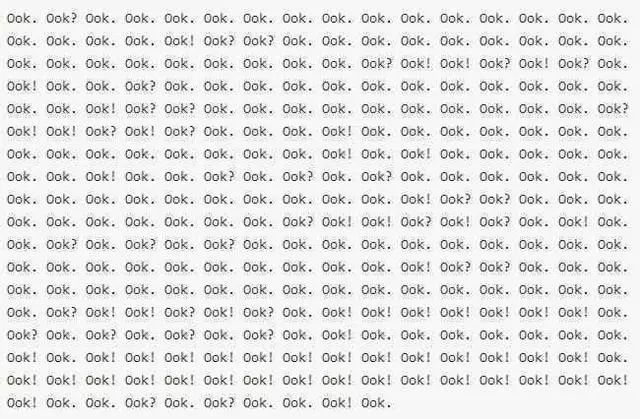 OOK!是为猩猩设计的编程语言。OOK!基本上与众所周知的深奥语言BrainF u~c~k是同构的 ,但是具有更少的语法元素。由于“ook”这个词可以根据变化的细微差别传达整个思想,情感和抽象思想,所以Ook!无需评论。代码本身可以很好地描述它的功能,以及它是如何实现的。