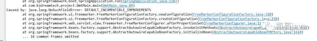 Error creating bean with name 'freeMarkerConfigurer' defined in class path resource [org/springframework/boot/autoconfigure/freemarker/FreeMarkerAutoConfiguration$FreeMarkerWebConfiguration.class]: Invocation of init method failed; nested exception is java.lang.NoSuchFieldError: DEFAULT_INCOMPATIBLE_IMPROVEMENTS