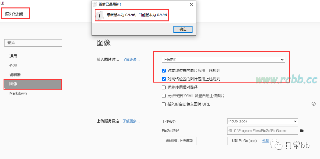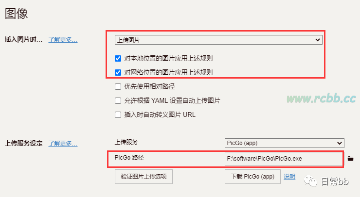 选中如图所示的选项,然后选中直接 PicGo 的安装路径,然后验证图片上传选项。