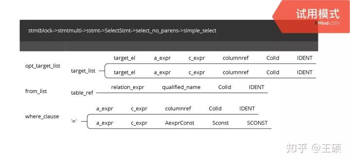 parser接收到scanner的返回值,将‘select’移进,发现属于stmtblock->stmtmulti->stmt->SelectStmt->select_no_parens->simple_select;