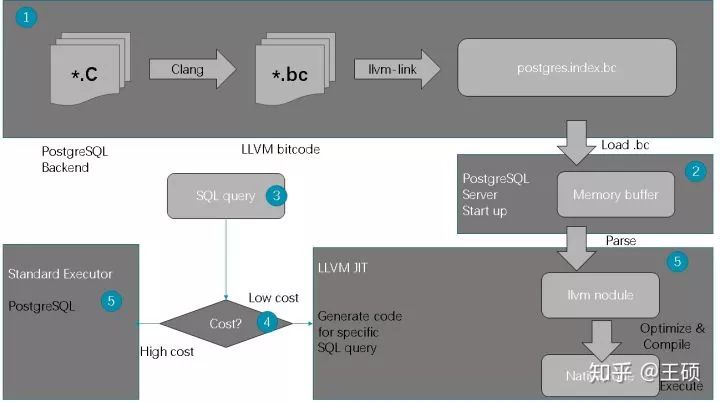 利用LLVM对SQL查询计划进行优化。随着现在存储技术的发展,尤其是内存、ssd硬件的发展,以及存储结构,如列存,如分布式,I/O瓶颈逐渐的在降低,而带来的影响就是cpu的瓶颈来了。很多人可能会问cpu有什么瓶颈?现代数据库为了完成更多的用户操作,有很多的冗余操作。比如我们即便向数据库输入一个常量,数据库还是首先以字符串的形式拿过来,进行处理,经过很多步骤后,确认是常量,然后放入相应位置。这中间就出现了很多人工就能减少的步骤,而数据库或者计算机是不得而知的。Llvm是一款编译器后端。他能将程序语言转化为自己的中间语言,然后进行优化。它主要的作用就是减少cpu的指令数量,以及提高cpu cache利用率。如何理解llvm,如果大家了解java的话,可能就对JIT不陌生了。我们的Java之所以能够一次编程,处处运行,就是因为我们的JDK就是一个解释器。所有的java程序,都经过编译,编译为class文件。这个可以理解为java语言与机器语言的中间语言。而jdk可以将这中间语言重新解释,并优化为机器码,从而进行执行。pg现有的JIT技术也是相同的方式进行的。不同点在于,这里使用的是llvm作为中间语言的编译和解释、优化再执行。