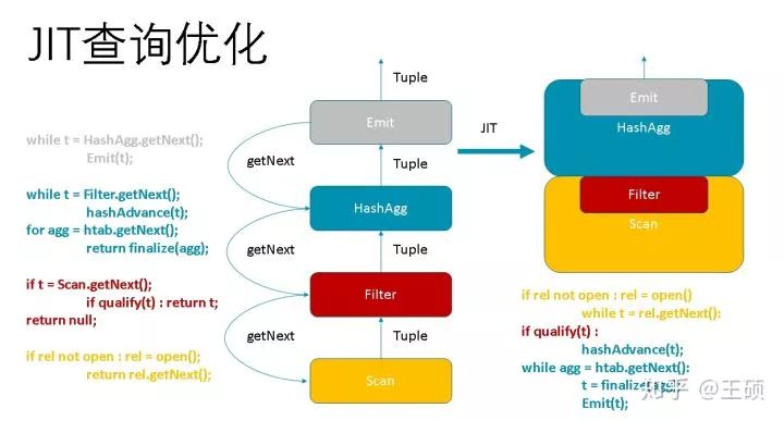 它是通过LLVM将查询计划转化为LLVM中间语言,然后对中间语言进行优化,减少冗余的指令集并提高cpu Cache的利用率。