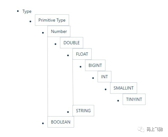 Hive的数据类型是可以进行隐式转换的,类似于Java的类型转换。如用户在查询中将一种浮点类型和另一种浮点类型的值做对比,Hive会将类型转换成两个浮点类型中值较大的那个类型,即:将FLOAT类型转换成DOUBLE类型;当然如果需要的话,任意整型会转化成DOUBLE类型。Hive 中基本数据类型遵循以下层次结构,按照这个层次结构,子类型到祖先类型允许隐式转换。如下图: