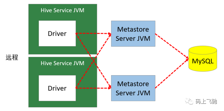 远程模式下,需要单独起metastore服务,然后每个客户端都在配置文件里配置连接到该metastore服务。远程模式的metastore服务和hive运行在不同的进程里。在生产环境中,建议用远程模式来配置Hive Metastore。