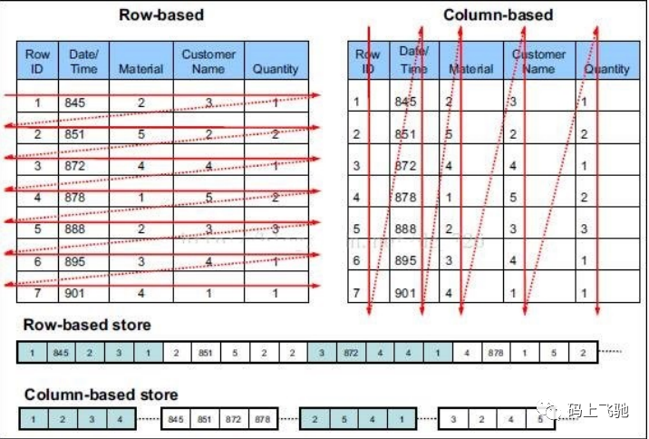 行式存储下一张表的数据都是放在一起的,但列式存储下数据被分开保存了。