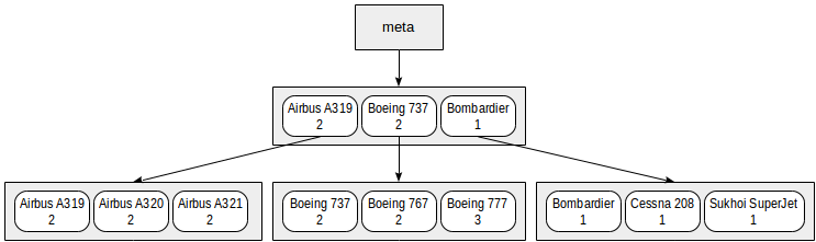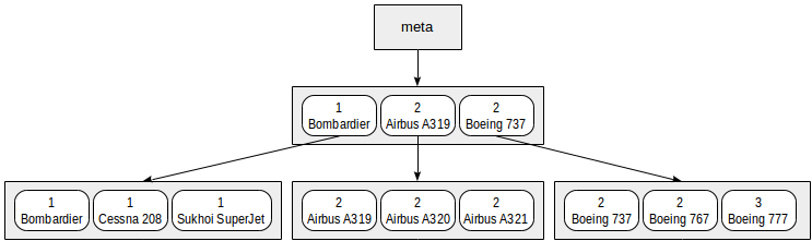 从此图表可以清楚地看出,通过像«class = 3»(仅在第一个字段中进行搜索)或«class = 3 and model = 'Boeing 777-300'»(在两个字段中进行搜索)这样的谓词进行搜索将有效地工作。