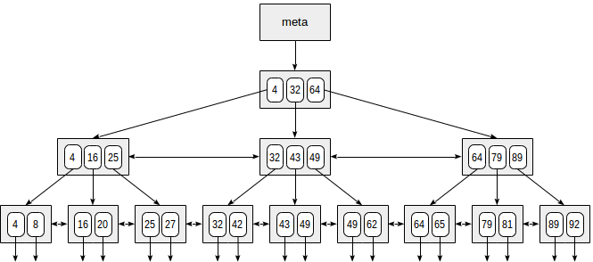 · 索引中的数据按非递减顺序排序(在页面之间和每个页面内部),并且同一级别的页面通过双向列表相互连接。因此,我们可以仅通过列表的一个方向或另一个方向获得有序数据集,而不必每次都返回到根。