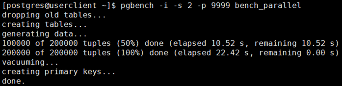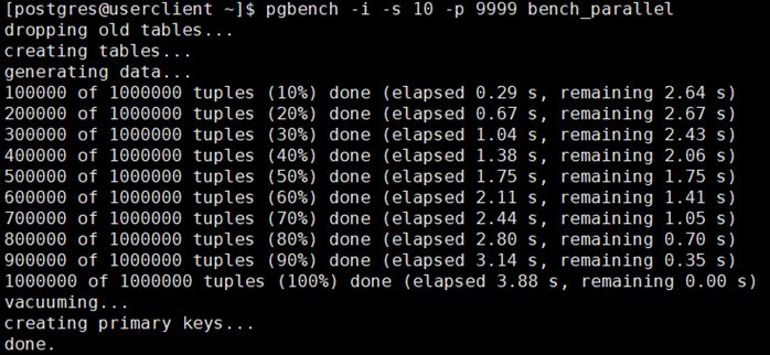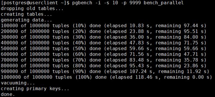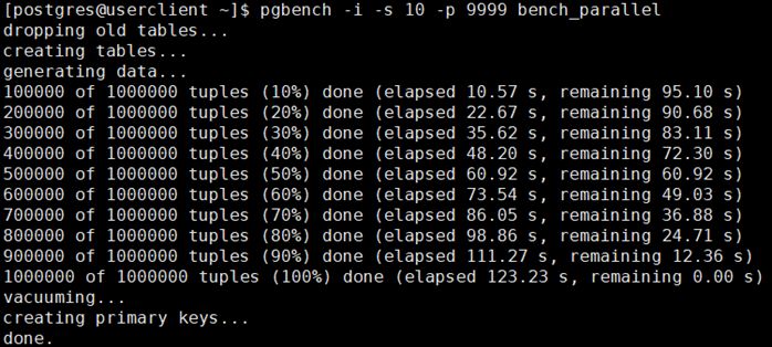 如果我们关闭parallel mode,在数据写入的过程中就会跳过分发部分,直接写入到主节点中。我们再用pgbench写入一百万条数据时,仅需要不4秒钟。