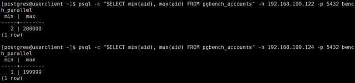 psql -c "SELECT min(aid), max(aid)FROM pgbench_accounts" -h 192.168.100.122 -p 5432 bench_parallelpsql -c "SELECT min(aid), max(aid)FROM pgbench_accounts" -h 192.168.100.124 -p 5432 bench_parallel