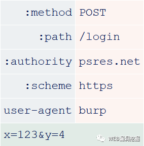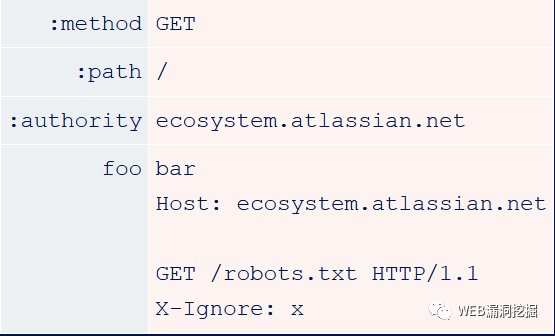 HTTP/1是一个基于文本的协议,因此提交的请求按照字符串操作进行解析。例如,服务器需要查找冒号以知道HTTP头中字段的name何时结束。这种方式中潜在的不确定性使得desync attack成为可能。HTTP/2是一个像TCP一样的二进制协议,所以是基于预定义的偏移量进行解析,不容易出现模糊性。本文使用人类可读的而不是真实的字节来表示HTTP/2请求。例如,在网络中,伪头的name实际上被划分为1个字节——它们实际上不包含冒号。