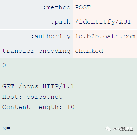 由于错误的Content-Length,后端提前停止处理请求,橙色的数据被视为另一个请求的开始。这使我能够向下一个请求添加任意前缀,而不管它是谁发送的。