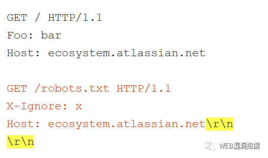 最初的补丁也没有过滤伪头,导致请求行注入漏洞。利用这些很简单,只要可视化注入发生的位置,并确保得到的HTTP/1.1请求是一个有效的请求行: