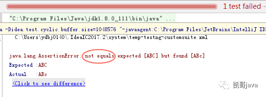 上面可以看出assertEquals(actual, expected,“message1”)中,如果现实结果和期待结果不相等,抛出断言异常并显示message1的内容,上面红圈就是我们填写的message1的内容。自动化测试一般喜欢带上这个message1,这样抛出错误,更能快速读懂错误的原因和错误的具体业务逻辑。