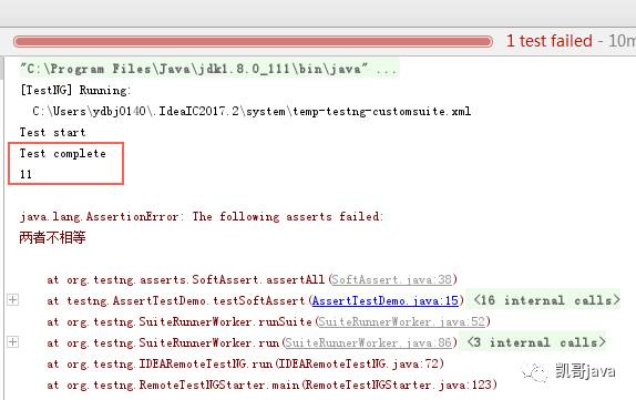 通过运行结果截图,我们可以看到在断言12和13相等的这行代码后面还有其他的语句,如果这里采用的是Hard Assert,那么Test complete 和 11是不会输出,也就是代码没有被执行。这个就是SoftAssert的优点,再强调一次,最后一定要调用assertAll()方法。
