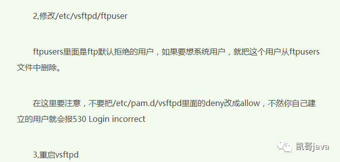 在这里要注意,不要把/etc/pam.d/vsftpd里面的deny改成allow,不然你自己建立的用户就会报530 Login incorrect