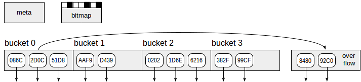 • 位图页面-跟踪当前清除的溢出页面,这些页面可重新用于其他存储桶。