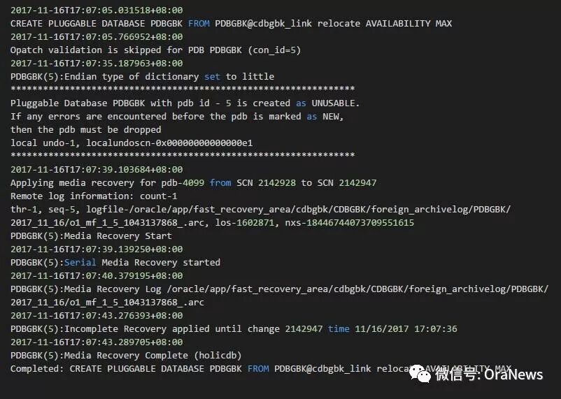 在目标库的PDB open时候,源库的alert记录relocate结束,源PDB删除操作: