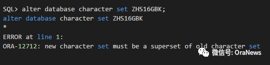 直接修改字符集报错,说明新设字符集必须是老字符集的超集