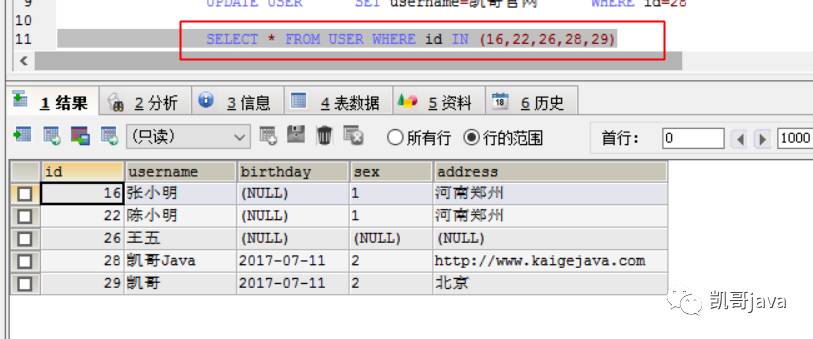 1.2:使用mybatis查询出16 /22 /26/28 /29这五个id的用户信息。