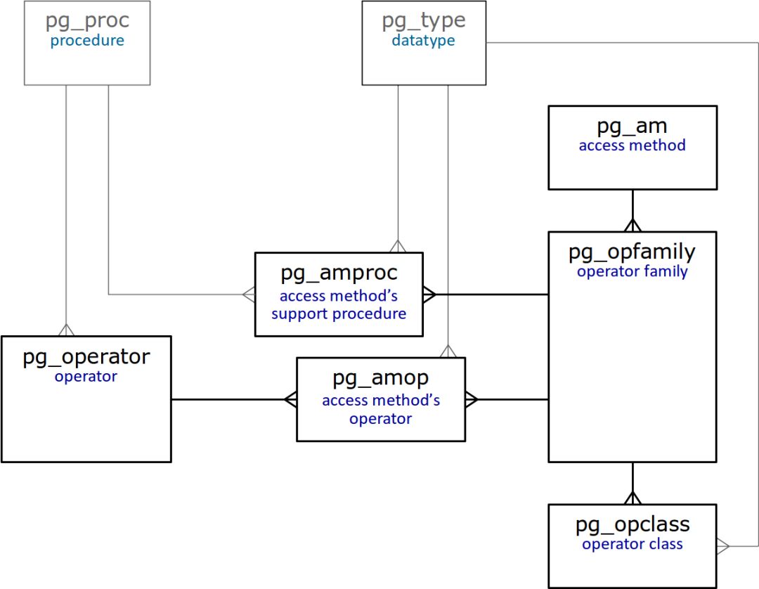 在本文的结尾,我们提供了系统目录中与运算符类和族直接相关的表的简化图。