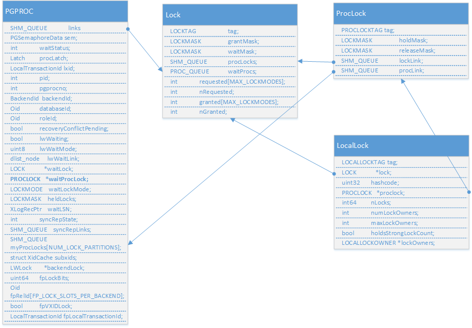 LockConfilicMap.pngtypedef struct LockMethodData{intnumLockModes;const LOCKMASK *conflictTab;const char *const * lockModeNames;const bool *trace_flag;} LockMethodData;typedef struct LOCKTAG{uint32locktag_field1; /* a 32-bit ID field */uint32locktag_field2; /* a 32-bit ID field */uint32locktag_field3; /* a 32-bit ID field */uint16locktag_field4; /* a 16-bit ID field */uint8locktag_type;/* see enum LockTagType */uint8locktag_lockmethodid;/* lockmethod indicator */} LOCKTAG;typedef struct LOCK{/* hash key */LOCKTAGtag;/* unique identifier of lockable object *//* data */LOCKMASKgrantMask;/* bitmask for lock types already granted */LOCKMASKwaitMask;/* bitmask for lock types awaited */SHM_QUEUEprocLocks;/* list of PROCLOCK objects assoc. with lock */PROC_QUEUEwaitProcs;/* list of PGPROC objects waiting on lock */intrequested[MAX_LOCKMODES];/* counts of requested locks */intnRequested;/* total of requested[] array */intgranted[MAX_LOCKMODES]; /* counts of granted locks */intnGranted;/* total of granted[] array */} LOCK;typedef struct PROCLOCKTAG{/* NB: we assume this struct contains no padding! */LOCK *myLock;/* link to per-lockable-object information */PGPROC *myProc;/* link to PGPROC of owning backend */} PROCLOCKTAG;typedef struct PROCLOCK{/* tag */PROCLOCKTAG tag;/* unique identifier of proclock object *//* data */LOCKMASKholdMask;/* bitmask for lock types currently held */LOCKMASKreleaseMask;/* bitmask for lock types to be released */SHM_QUEUElockLink;/* list link in LOCK's list of proclocks */SHM_QUEUEprocLink;/* list link in PGPROC's list of proclocks */} PROCLOCK;typedef struct LOCALLOCKTAG{LOCKTAGlock;/* identifies the lockable object */LOCKMODEmode;/* lock mode for this table entry */} LOCALLOCKTAG;typedef struct LOCALLOCKOWNER{/** Note: if owner is NULL then the lock is held on behalf of the session;* otherwise it is held on behalf of my current transaction.** Must use a forward struct reference to avoid circularity.*/struct ResourceOwnerData *owner;int64nLocks;/* # of times held by this owner */} LOCALLOCKOWNER;typedef struct LOCALLOCK{/* tag */LOCALLOCKTAG tag;/* unique identifier of locallock entry *//* data */LOCK *lock;/* associated LOCK object, if any */PROCLOCK *proclock;/* associated PROCLOCK object, if any */uint32hashcode;/* copy of LOCKTAG's hash value */int64nLocks;/* total number of times lock is held */intnumLockOwners;/* # of relevant ResourceOwners */intmaxLockOwners;/* allocated size of array */boolholdsStrongLockCount;/* bumped FastPathStrongRelationLocks */LOCALLOCKOWNER *lockOwners; /* dynamically resizable array */} LOCALLOCK;static HTAB *LockMethodLockHash;static HTAB *LockMethodProcLockHash;static HTAB *LockMethodLocalHash;typedef struct{slock_tmutex;uint32count[FAST_PATH_STRONG_LOCK_HASH_PARTITIONS];} FastPathStrongRelationLockData;