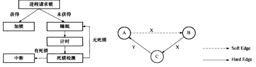 在DeadLockCheck{DeadLockCheckRecurse(proc)-->TestConfiguration(proc)//测试是否deadlock,如果存在,是hard deadlock还是soft deadlock ,返回值-1代表hard deadlock,0代表无死锁,>1代表死锁环中soft edge的数量-->ExpandConstraints(curConstraints, nCurConstraints)-->调用TopoSort对curConstraints边中的lock的waitProcs进行排列,将curConstraints中的waiter拍到blocker的前面,其他顺序不变。-->对curConstraints中的所有边,分别以这条边的waiter和blocker作为起点调用FindLockCycle查找是否存在死锁环。最后对测试起始点的Proc调用FindLockCycle查找是否存在死锁环。返回-->if (nEdges < 0)return true;/*硬死锁*/if (nEdges == 0)return false;/* good configuration found */if (nCurConstraints >= maxCurConstraints)return true;/* out of room for active constraints? *///从软死锁环中按顺序取soft edge,作为constraint然后递归调用DeadLockCheckRecursefor (i = 0; i < nEdges; i++){if (!savedList && i > 0){/* Regenerate the list of possible added constraints */if (nEdges != TestConfiguration(proc))elog(FATAL, "inconsistent results during deadlock check");}curConstraints[nCurConstraints] =possibleConstraints[oldPossibleConstraints + i];nCurConstraints++;if (!DeadLockCheckRecurse(proc))return false;/* found a valid solution! *//* give up on that added constraint, try again */nCurConstraints--;}}