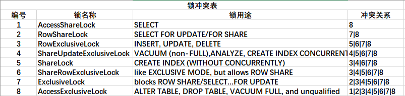 /* NoLock is not a lock mode, but a flag value meaning "don't get a lock" */#define NoLock0#define AccessShareLock1/* SELECT */#define RowShareLock2/* SELECT FOR UPDATE/FOR SHARE */#define RowExclusiveLock3/* INSERT, UPDATE, DELETE */#define ShareUpdateExclusiveLock 4/* VACUUM (non-FULL),ANALYZE, CREATE INDEX CONCURRENTLY */#define ShareLock5/* CREATE INDEX (WITHOUT CONCURRENTLY) */#define ShareRowExclusiveLock6/* like EXCLUSIVE MODE, but allows ROW SHARE */#define ExclusiveLock7/* blocks ROW SHARE/SELECT...FOR UPDATE */#define AccessExclusiveLock8/* ALTER TABLE, DROP TABLE, VACUUM FULL, and unqualified LOCK TABLE */