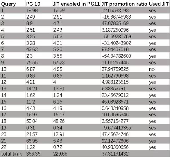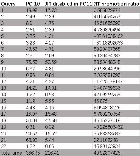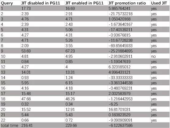 我认为客观地说,JIT并不适用于所有工作负载,但是JIT为正确的工作负载提供良好的性能。在使用OLAP基准测试的情况下。我们可以认为JIT在22个查询的情况下提供了良好的性能,在某些查询中,JIT的性能降低了。